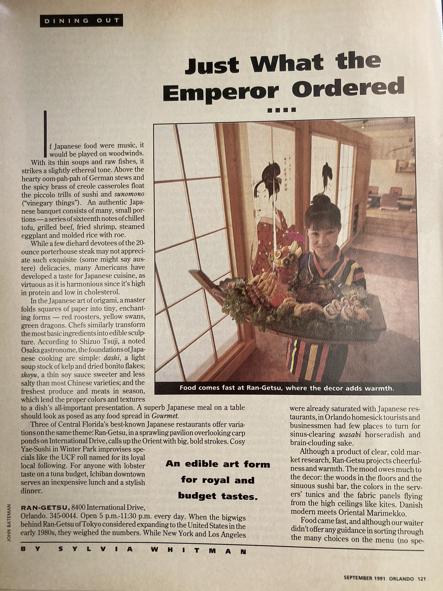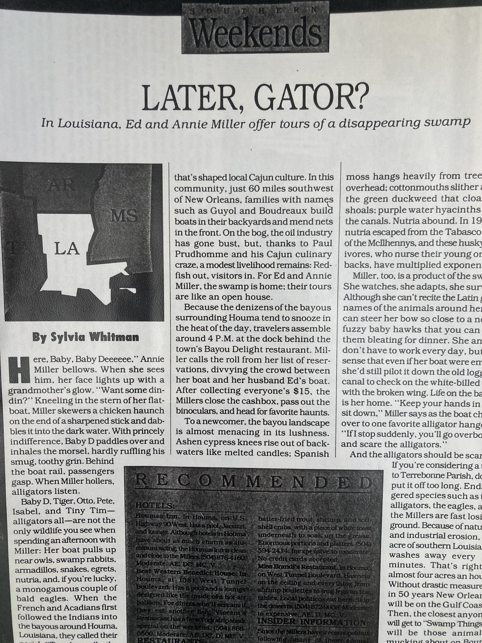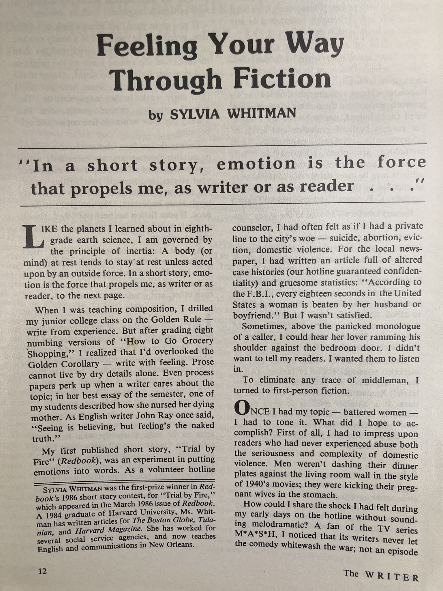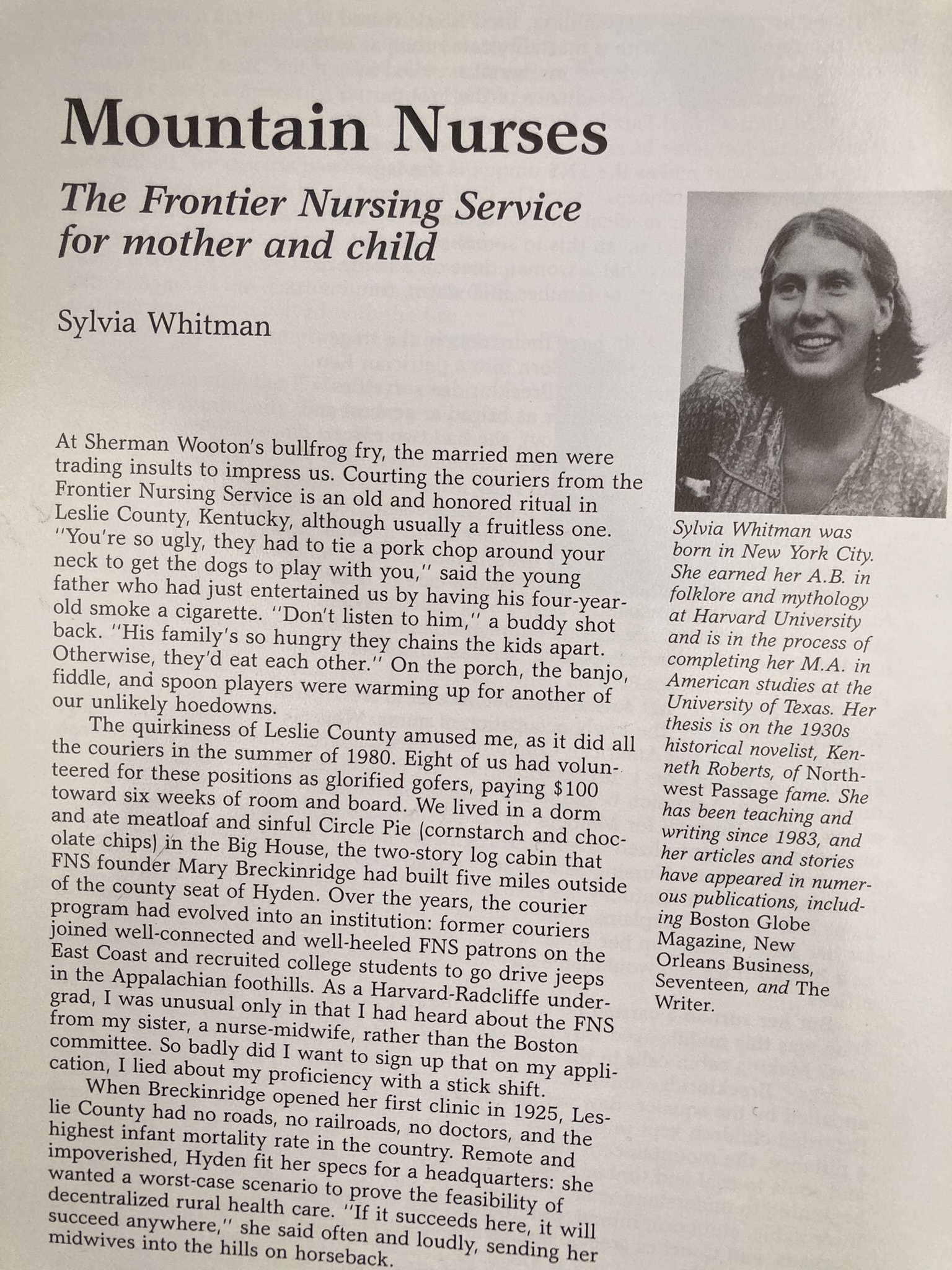 941CEO, Alcalde, Ascent, Boston Globe Magazine, Boston Phoenix, Bride’s, Central Florida Magazine, Creative Ideas for Living, Fiction University (blog), Florida Review, France Today, Gamut, Go, Good Old Days, Harvard Crimson, Harvard Magazine, The HerStories Project, Horn Book, Hudson Valley, Human Rights, The Humanist, Inside, Japanophile, Journal of the West, Ladies Home Journal, Law and Order, The Legal Review, Los Angeles Times, Louisiana Life, Louisiana Literature, McCall’s, Meetings and Conventions, Miami Herald, National Culinary Review, New Orleans Business, Odet, Orlando, Orlando Sentinel, Poughkeepsie Journal, RE: Arts and Letters, Reader’s Digest, Redbook, The Rotarian, Sarasota Magazine, Scene, Sky, Southern Discourse, Southern Magazine, Student Lawyer, The Sun, Tulanian, Venice Magazine, The Weekly, The Writer, Writer’s Digest … and the “Environment Notebook” on WMFE in Orlando.